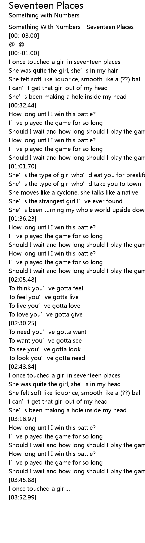 | [00:-04.00] | Something With Numbers - Seventeen Places |