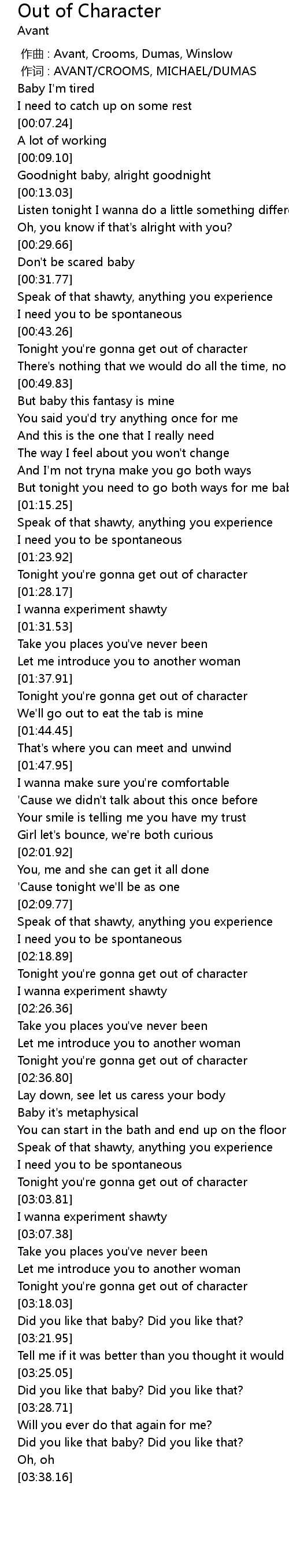 | [00:43.77] | Tonight you' re gonna get out of character |