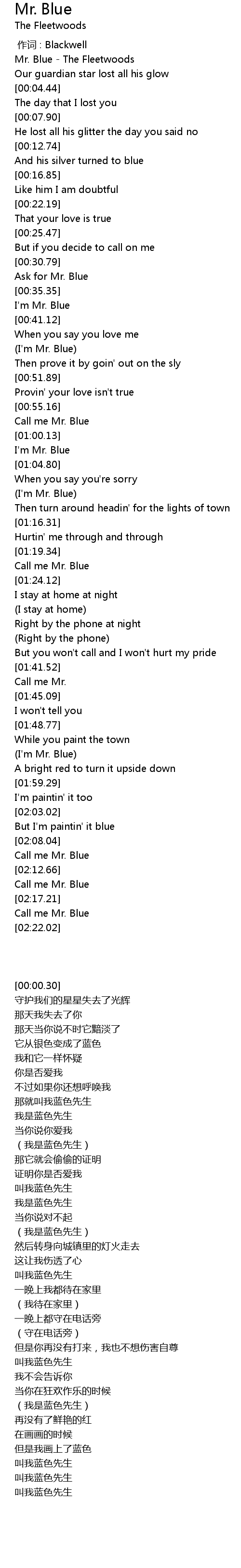 | [00:00.30] | Mr. Blue - The Fleetwoods |