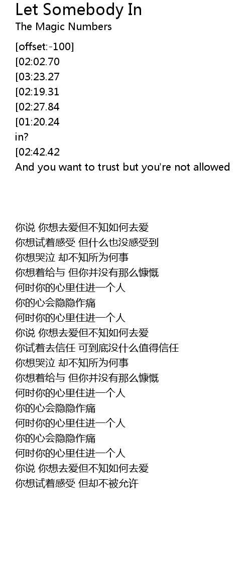 | [01:10.69][01:20.24][02:38.01][02:47.32][03:07.04] | When you gonna let somebody in? |