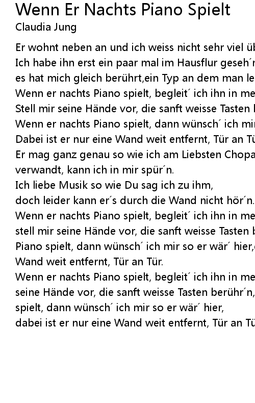| Wenn er nachts Piano spielt, begleit ich ihn in meinen Tr umen, stell mir seine H nde vor, die sanft weisse Tasten berü hr n, Wenn er nachts Piano spielt, dann wü nsch ich mir so er w r hier, | |