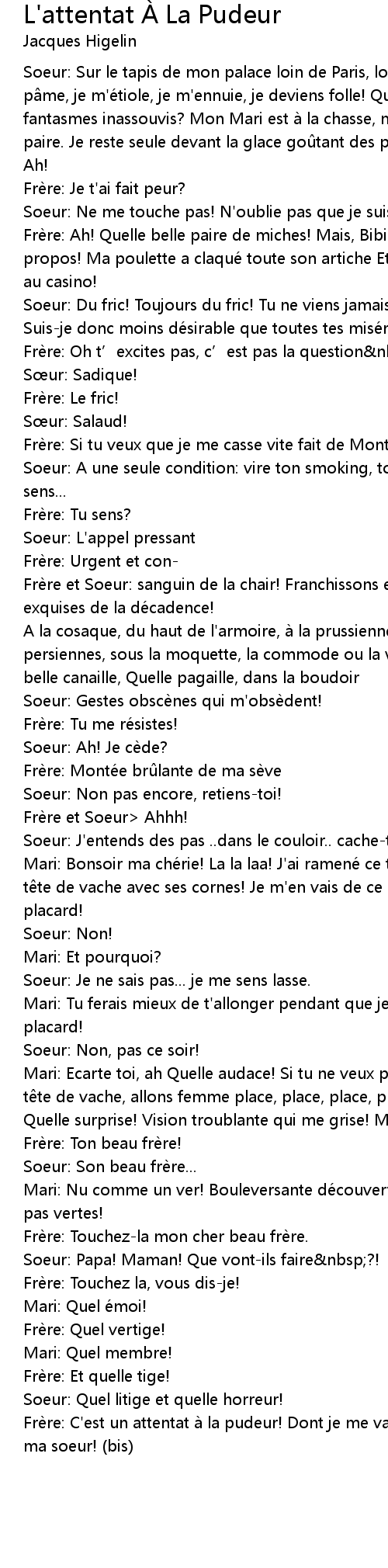 | Frè re: C' est un attentat à la pudeur! Dont je me vante, vante, vante, devant ma soeur! bis |
