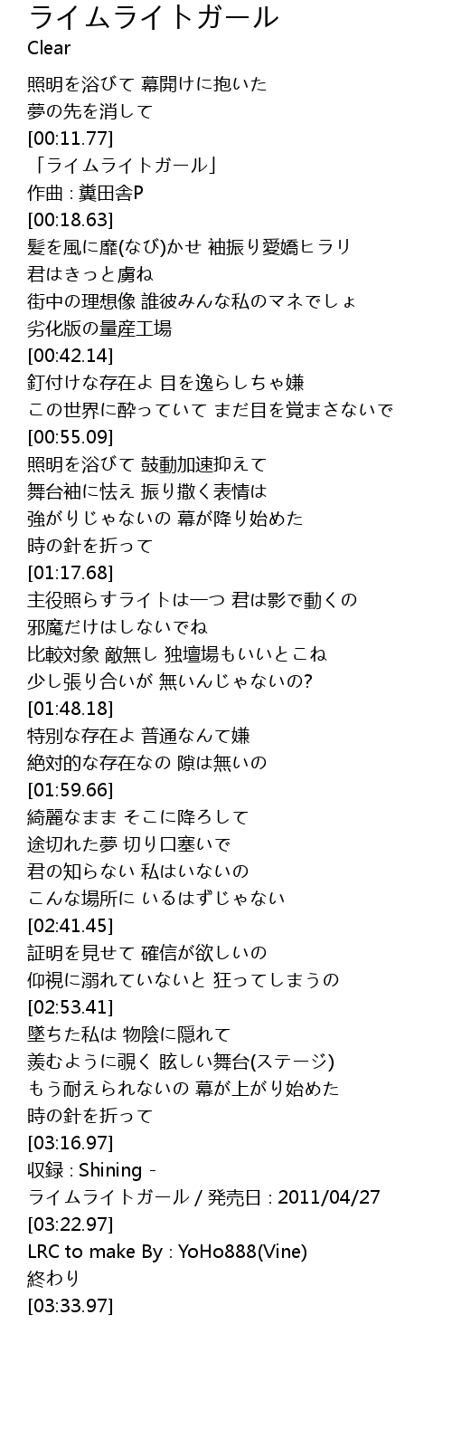 | [03:18.97] | 収録∶Shining - ライムライトガール/発売日∶2011/04/27 |