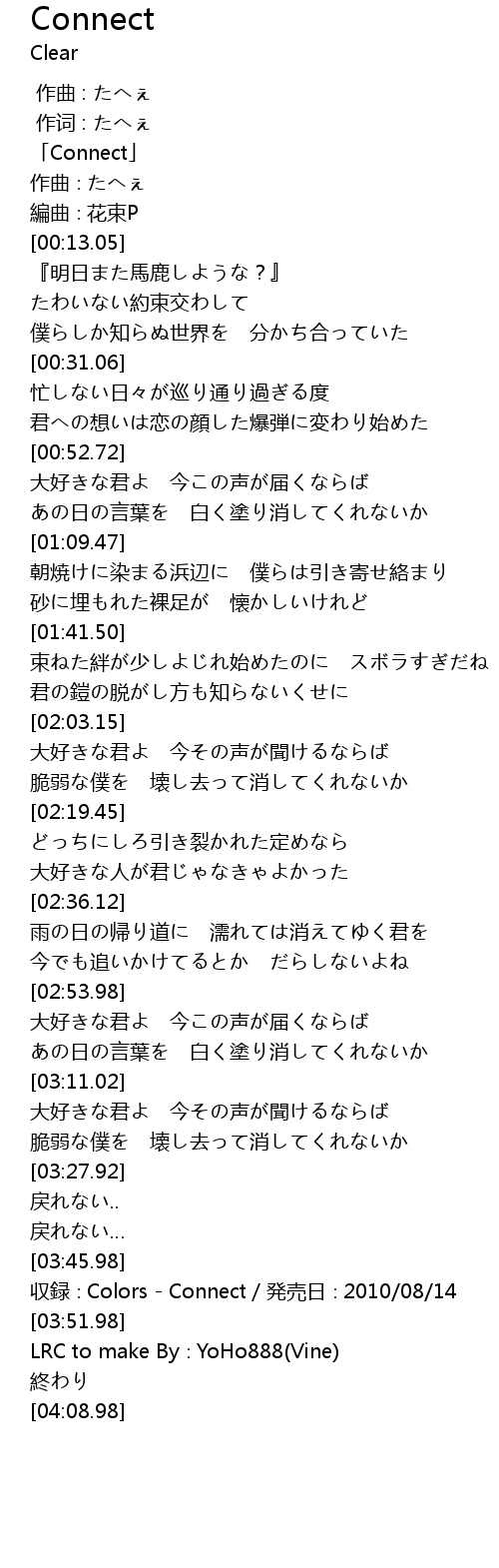 | [03:48.98] | 収録∶Colors - Connect/発売日∶2010/08/14 |