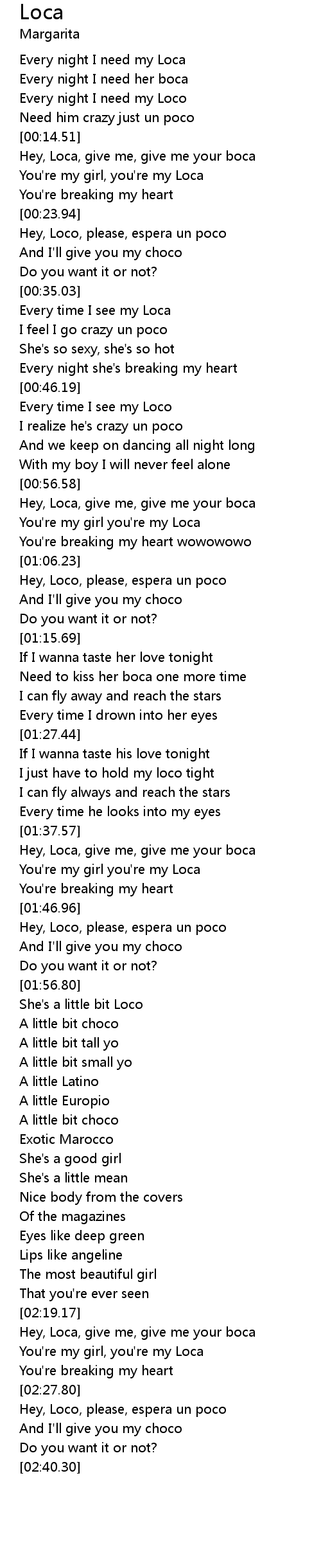 | [02:19.46] | Hey, Loca, give me, give me your boca |