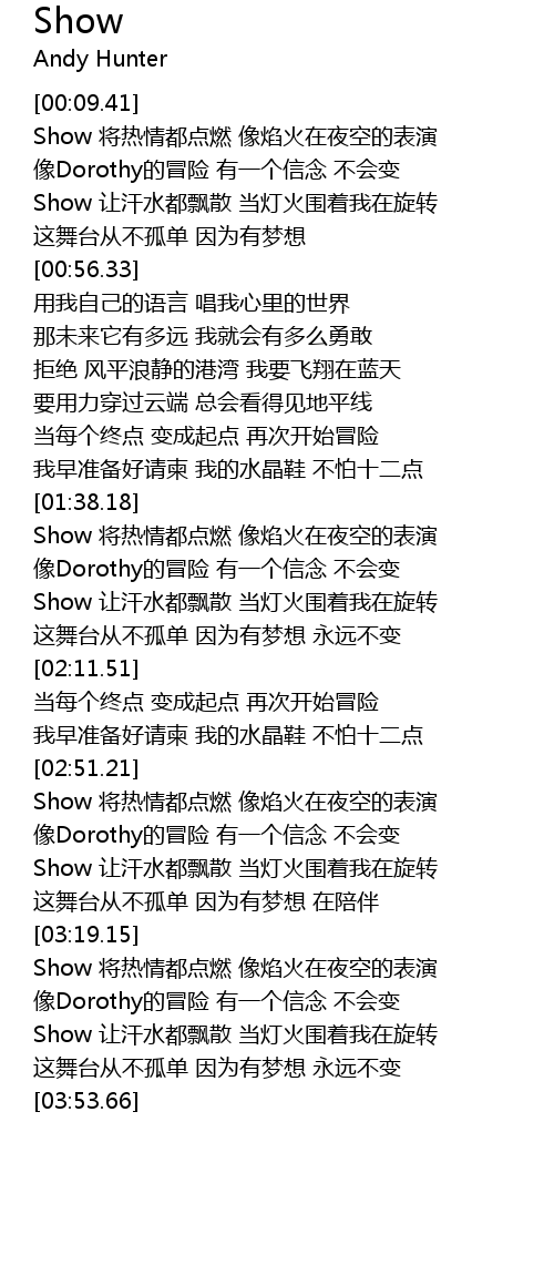 | [00:43.19] | Show 让汗水都飘散 当灯火围着我在旋转 |