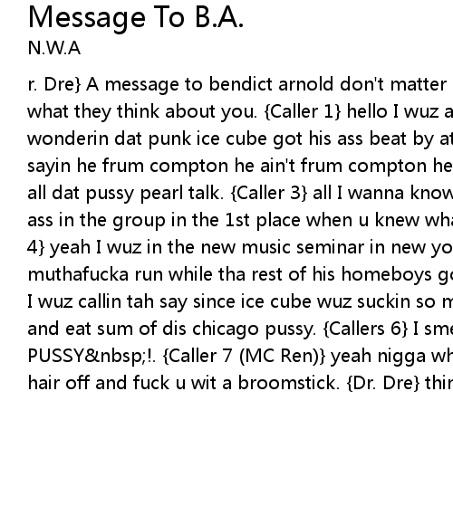 r. Dre} A message to bendict arnold don't matter how hard you try to be here's what they think about you. {Caller 1} hello I wuz at celebreality and I wuz wonderin dat punk ice cube got his ass beat by atl. {Caller 2} yo dat nigga wuz sayin he frum compton he ain't frum compton he frum a planet called punk with all dat pussy pearl talk. {Caller 3} all I wanna know iz why yall let his punk ass in the group in the 1st place when u knew what kinda bitch he wuz. {Caller 4} yeah I wuz in the new music seminar in new york and I watch that punk muthafucka run while tha rest of his homeboys got dey ass beat {Caller 5} hello I wuz callin tah say since ice cube wuz suckin so much new york dick can he come and eat sum of dis chicago pussy. {Callers 6} I smell *sniff *sniff PUSSY !. {Caller 7 (MC Ren)} yeah nigga when we see yo azz we go cut your hair off and fuck u wit a broomstick. {Dr. Dre} think about punk muthafucka