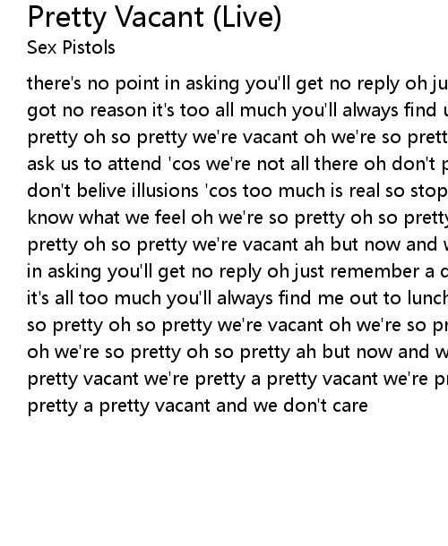 there's no point in asking you'll get no reply oh just remember a don't decide i got no reason it's too all much you'll always find us out to lunch oh we're so pretty oh so pretty we're vacant oh we're so pretty oh so pretty a vacant don'y ask us to attend 'cos we're not all there oh don't pretend 'cos i don't care i don't belive illusions 'cos too much is real so stop you'r cheap comment 'cos we know what we feel oh we're so pretty oh so pretty we're vacant oh we're so pretty oh so pretty we're vacant ah but now and we don't care there's no piont in asking you'll get no reply oh just remember a don't decide i got no reason it's all too much you'll always find me out to lunch we're out on lunch oh we're so pretty oh so pretty we're vacant oh we're so pretty oh so pretty we're vacant oh we're so pretty oh so pretty ah but now and we don't care we're pretty a pretty vacant we're pretty a pretty vacant we're pretty a pretty vacant we're pretty a pretty vacant and we don't care |