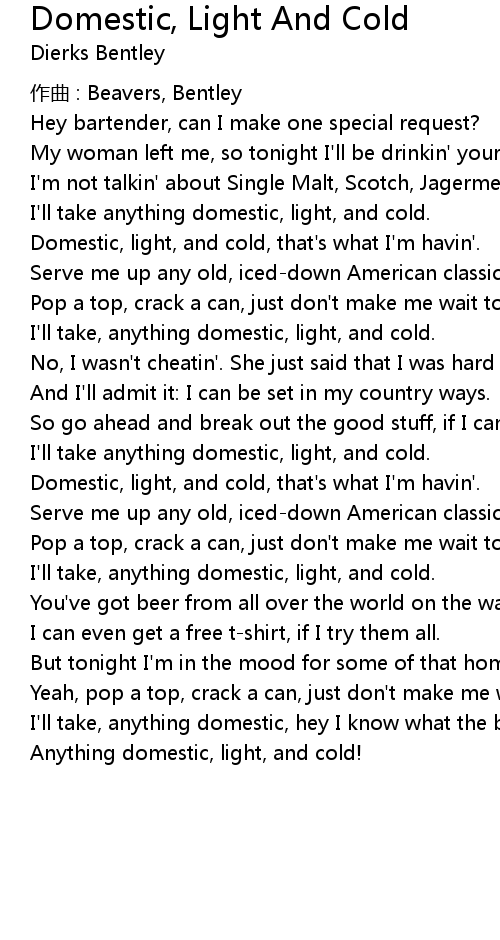 | Domestic, light, and cold, that' s what I' m havin'. | |