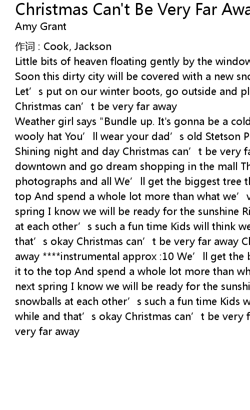 | Weather girl says " Bundle up. It' s gonna be a cold one." I' ll put on my wooly hat You' ll wear your dad' s old Stetson Pretty lights are everywhere Shining night and day Christmas can' t be very far away Let' s take a walk downtown and go dream shopping in the mall The kids can do the Santa thing, photographs and all We' ll get the biggest tree this year and trim it to the top And spend a whole lot more than what we' ve got But so what Come next spring I know we will be ready for the sunshine Right now throwin' snowballs at each other' s such a fun time Kids will think we' re crazy for a while and that' s okay Christmas can' t be very far away Christmas can' t be very far away instrumental approx : 10 We' ll get the biggest tree this year and trim it to the top And spend a whole lot more than what we' ve got But so what Come next spring I know we will be ready for the sunshine Right now throwin' snowballs at each other' s such a fun time Kids will think we' re crazy for a while and that' s okay Christmas can' t be very far away Christmas can' t be very far away |