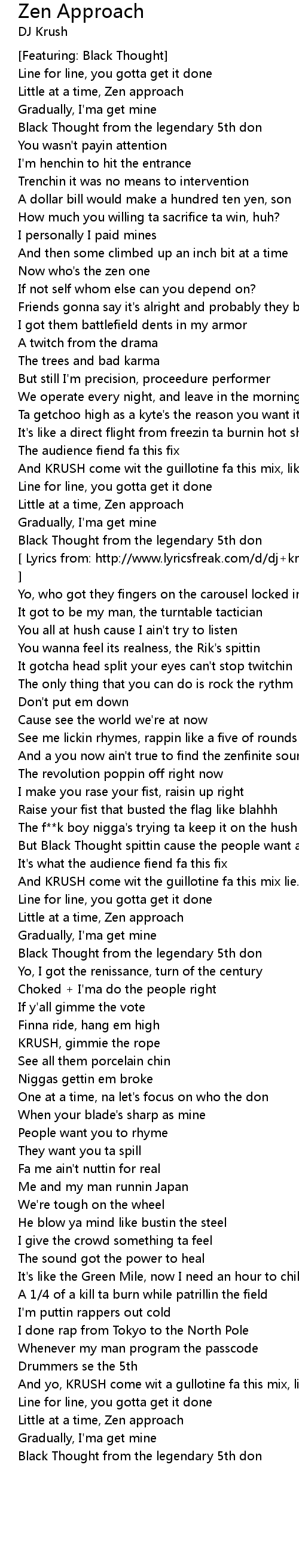| [ Lyrics from: http://www.lyricsfreak.com/d/dj+krush/zen+approach_20356187.html ] | |