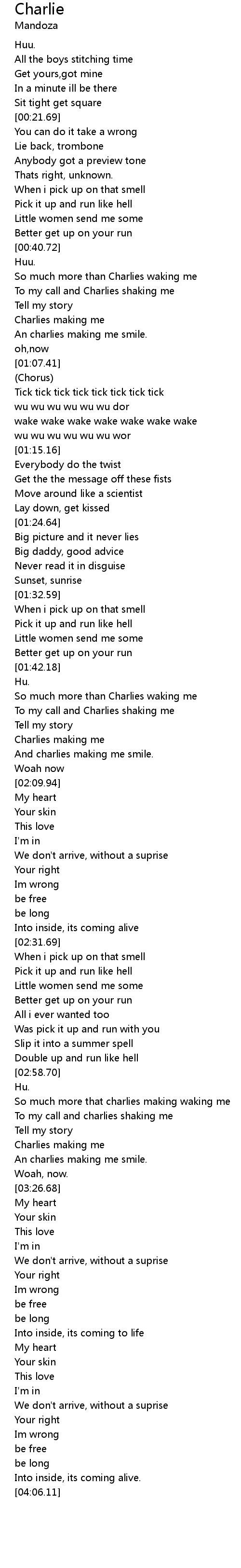 | [03:19.36] | Charlies making me |