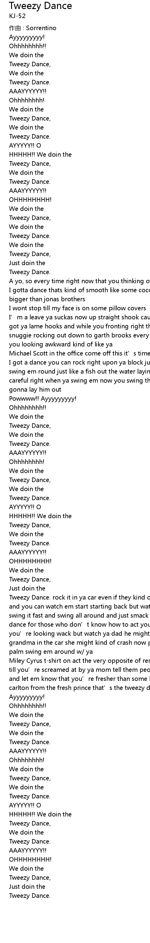 | Tweezy Dance. rock it in ya car even if they kind of laugh pull up to the light and you can watch em start starting back but watch ya arm man when you might swing it fast and swing all around and just smack it on the dash this is the dance for those who don’t know how to act you do it right every time that you’re looking wack but watch ya dad he might throw out his back but watch ya grandma in the car she might kind of crash now put ya fingers down inside ya palm swing em around w/ ya | |