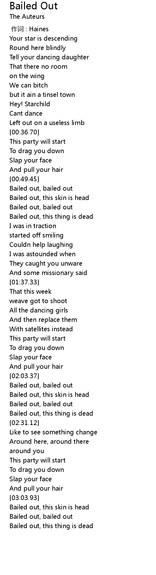 | [03:22.90] | Bailed out, bailed out |