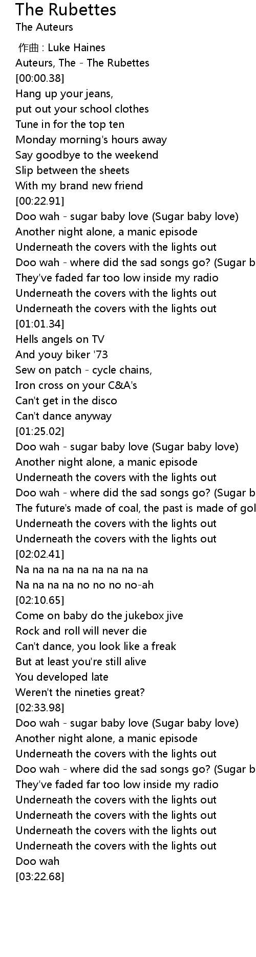 | [00:41.61] | Doo wah where did the sad songs go? Sugar baby love |