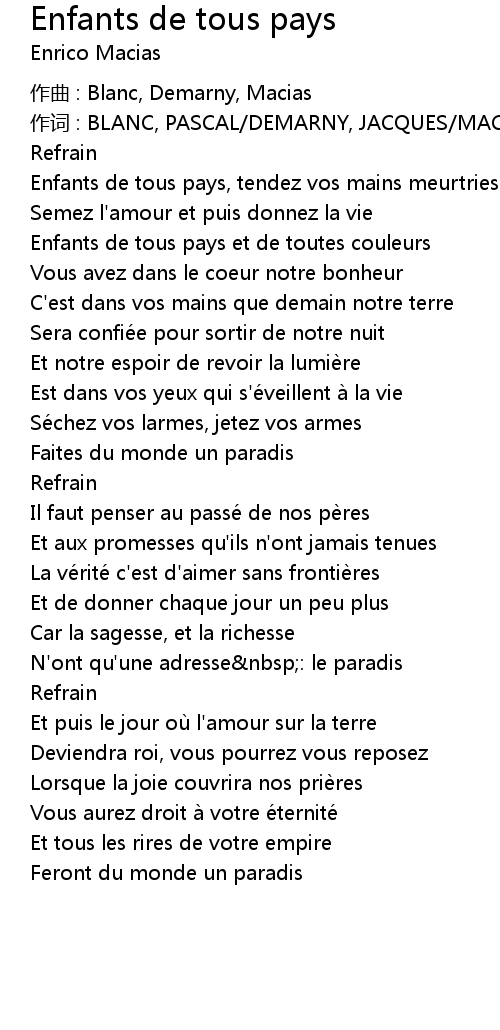 | 作词 : BLANC, PASCAL/DEMARNY, JACQUES/MACIAS, ENRICO | |