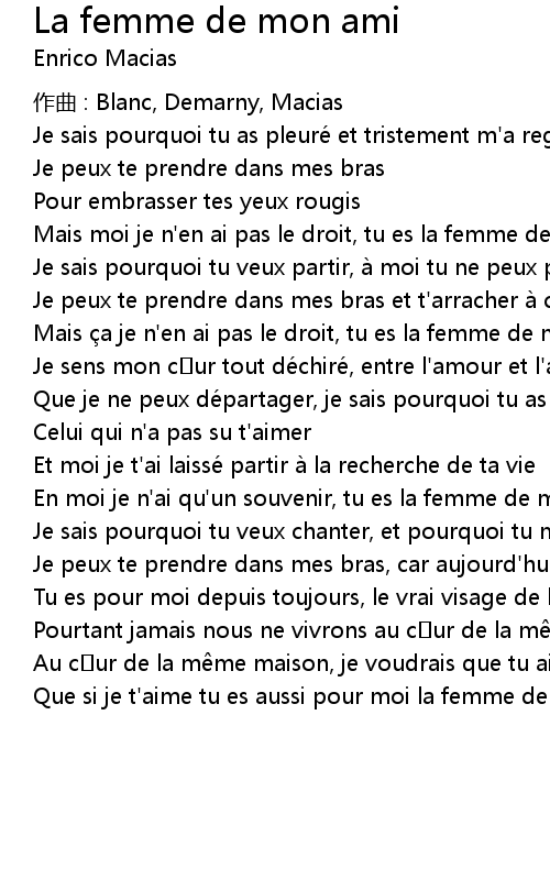 | Que si je t'aime tu es aussi pour moi la femme de mon ami, de mon ami. |
