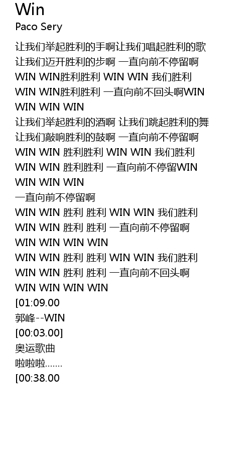 | [01:39.00] | WIN WIN 胜利胜利 WIN WIN 我们胜利 |