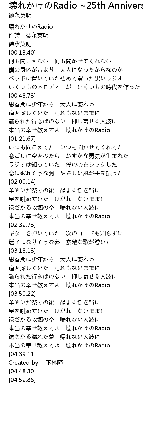 | [04:13.77] | 本当の幸せ教えてよ 壊れかけのRadio |