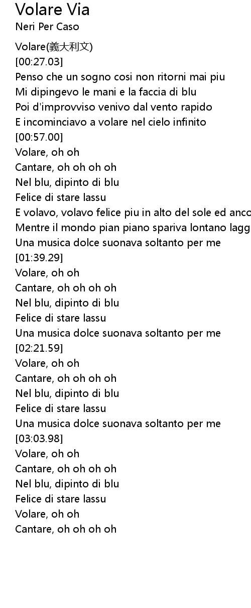 | [01:19.53] | E volavo, volavo felice piu in alto del sole ed ancora piu su |