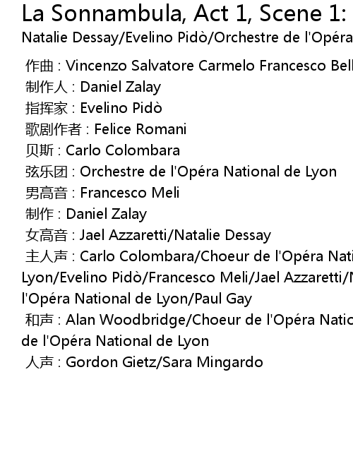 | [00:00.000] | zhǔ rén shēng : Carlo Colombara Choeur de l' Opé ra National de Lyon Evelino Pidò Francesco Meli Jael Azzaretti Natalie Dessay Orchestre de l' Opé ra National de Lyon Paul Gay |