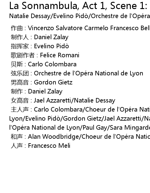| [00:00.000] | zhu ren sheng : Carlo Colombara Choeur de l' Ope ra National de Lyon Evelino Pido Gordon Gietz Jael Azzaretti Natalie Dessay Orchestre de l' Ope ra National de Lyon Paul Gay Sara Mingardo |