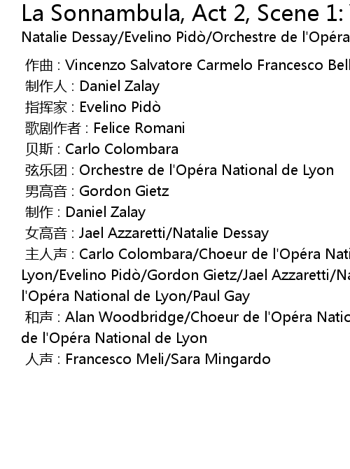 | [00:00.000] | zhǔ rén shēng : Carlo Colombara Choeur de l' Opé ra National de Lyon Evelino Pidò Gordon Gietz Jael Azzaretti Natalie Dessay Orchestre de l' Opé ra National de Lyon Paul Gay |