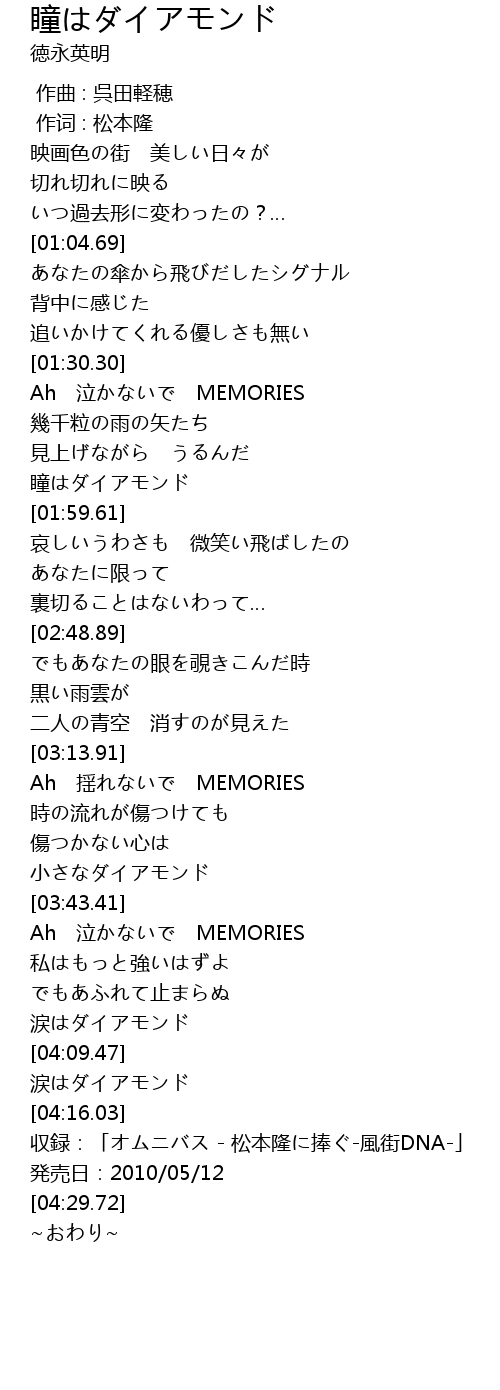 | [04:04.71] | 涙はダイアモンド |
