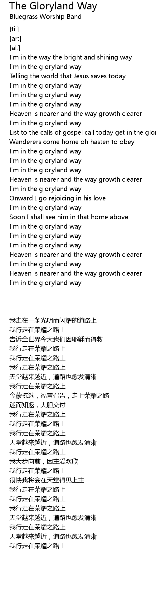 [00:57.20] List to the calls of gospel call today get in the gloryland way