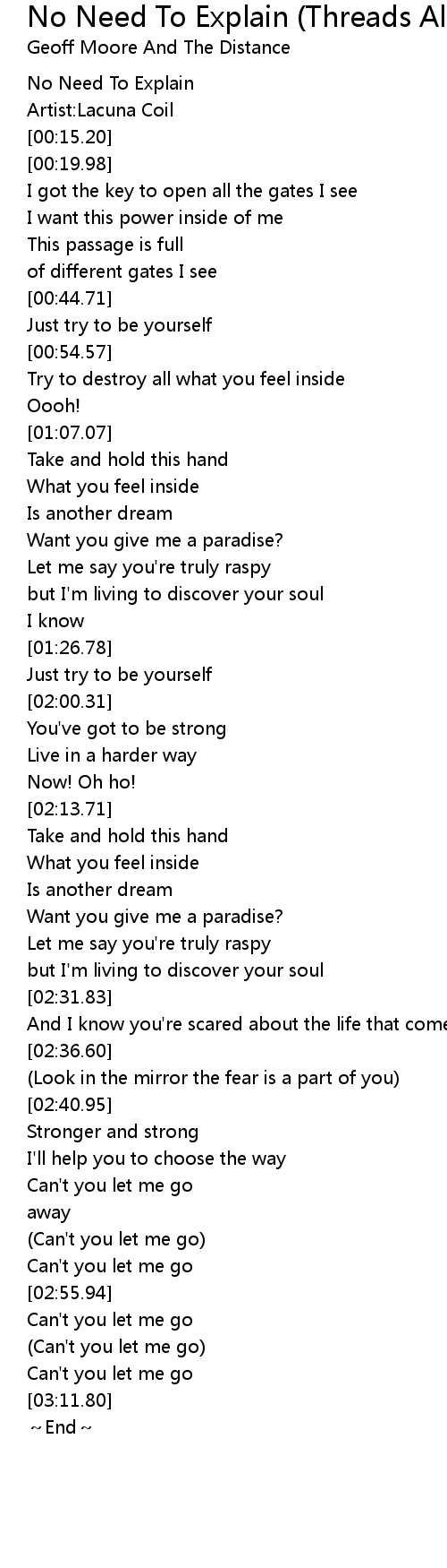| [02:36.90] | (Look in the mirror the fear is a part of you) |