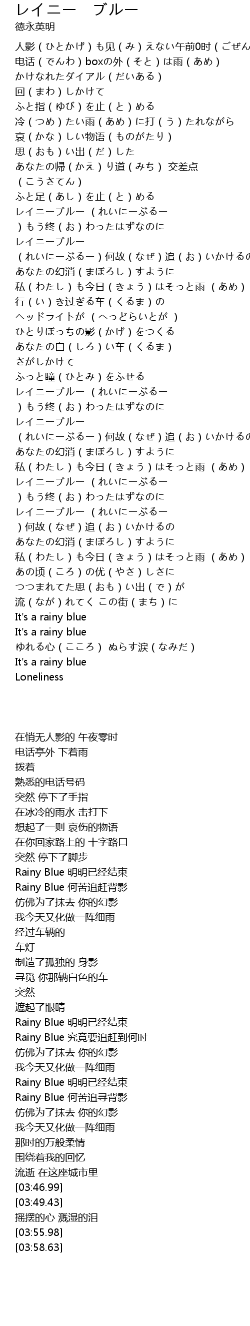 | [03:08.68] | レイニーブルー (れいにーぶるー )もう终(お)わったはずなのに |