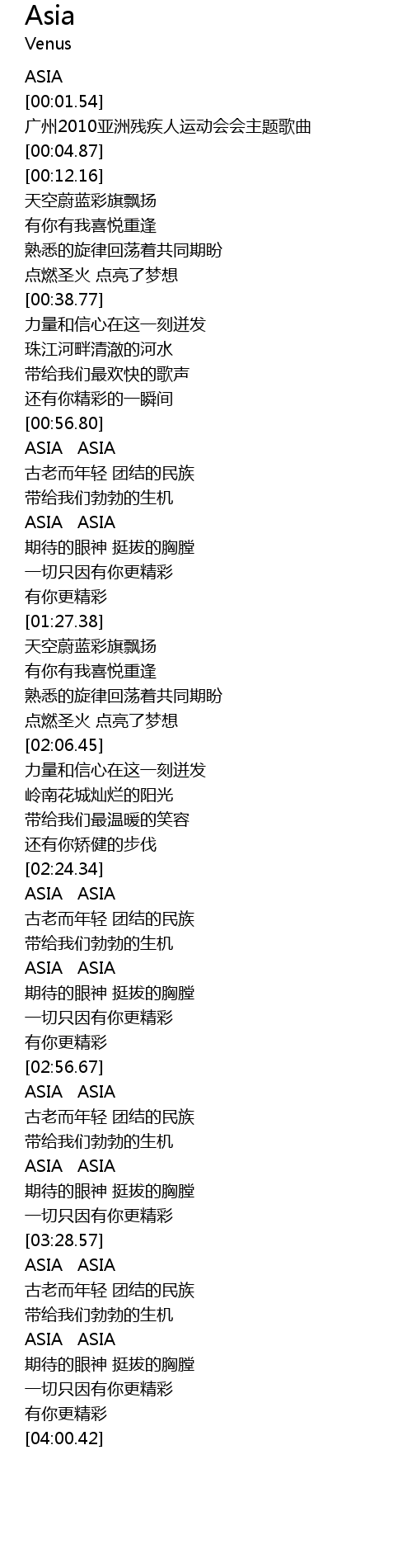 | [00:03.33] | 广州2010亚洲残疾人运动会会主题歌曲 |