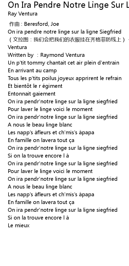 | [00:00.172] | On ira pendre notre linge sur la ligne Siegfried (文拉图:我们会把我们的衣服挂在齐格菲防线上) - Ray Ventura |