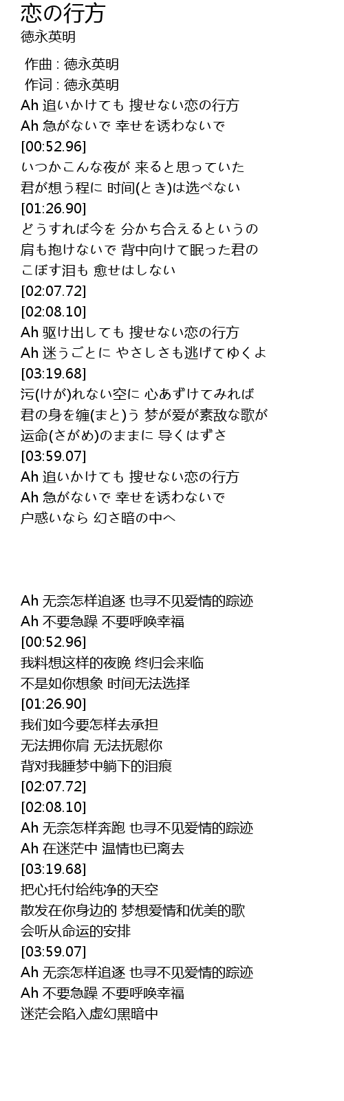 | [04:00.13] | Ah 追いかけても 搜せない恋の行方 |