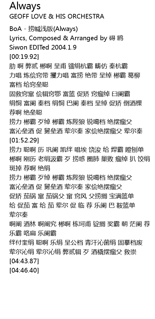 | [00:00.88] | BoA - 捞喊浅版(Always) |