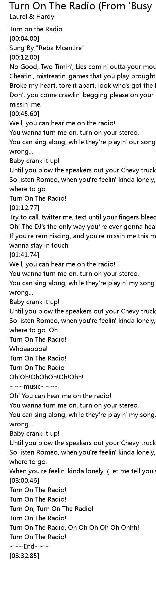 | [03:12.84] | Turn On, Turn On The Radio! |