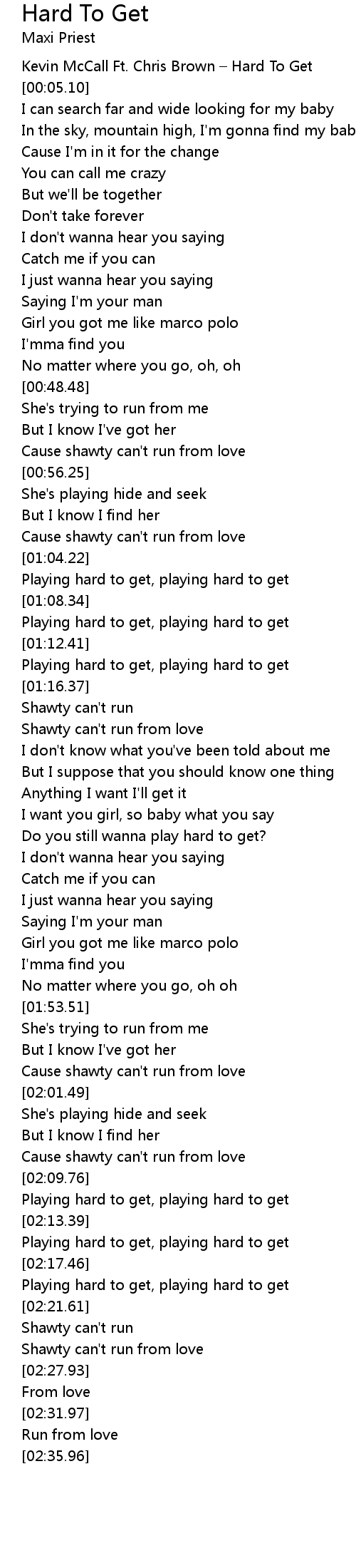 | [00:00.00] | Kevin McCall Ft. Chris Brown Hard To Get |