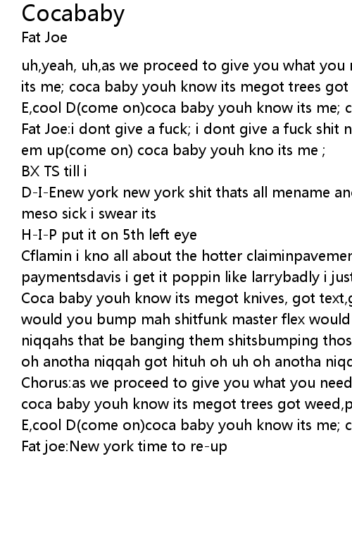 Fat Joe:i dont give a fuck; i dont give a fuck shit never gave a fuck but i hit em up(come on) coca baby youh kno its me ; |