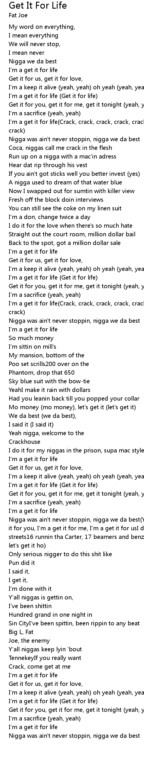 Nigga was ain't never stoppin, nigga we da best(Yeah, I'm gon get itI'm gon get it for you, I'm a get it for me, I'm a get it for usI does this for the streets16 runnin tha Carter, 17 beamers and benz'sMulti-millions nigga, yeah let's get it ho) |