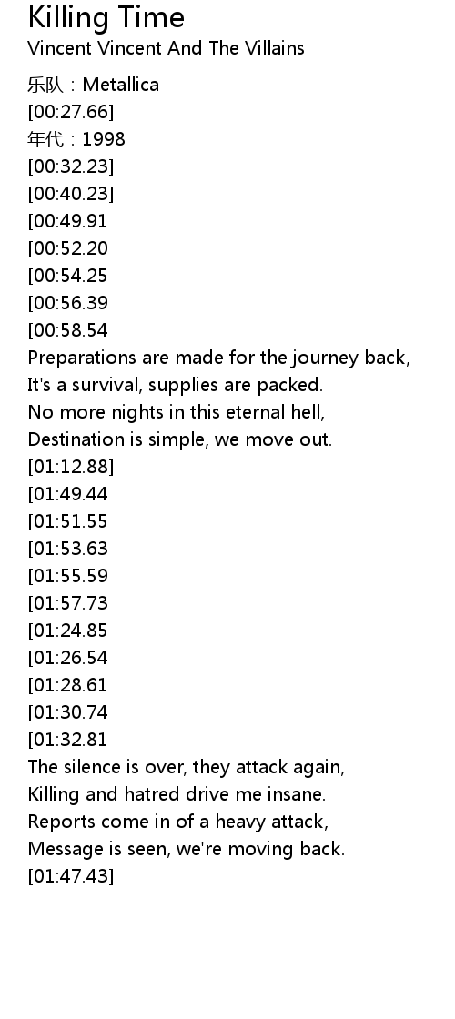 | [02:47.72][01:51.55][01:16.88] | . Killing time Your turn to kill. |