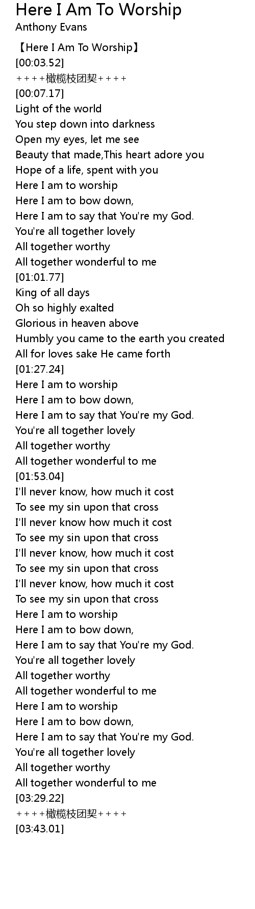 | [00:00.00] | 【Here I Am To Worship】 |