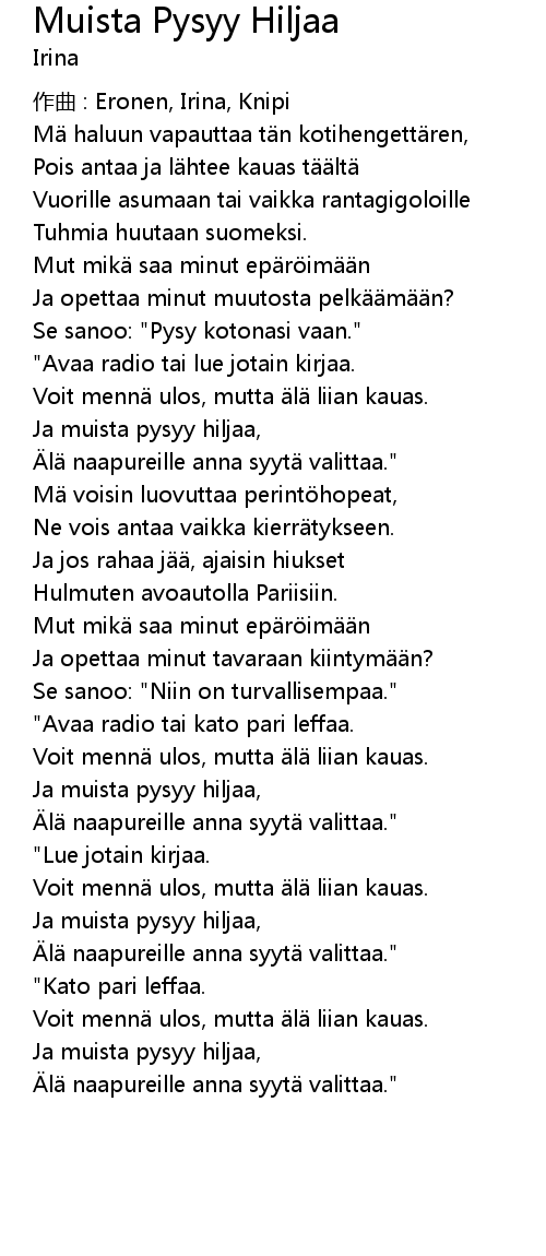 | Mä haluun vapauttaa tän kotihengettären, | |