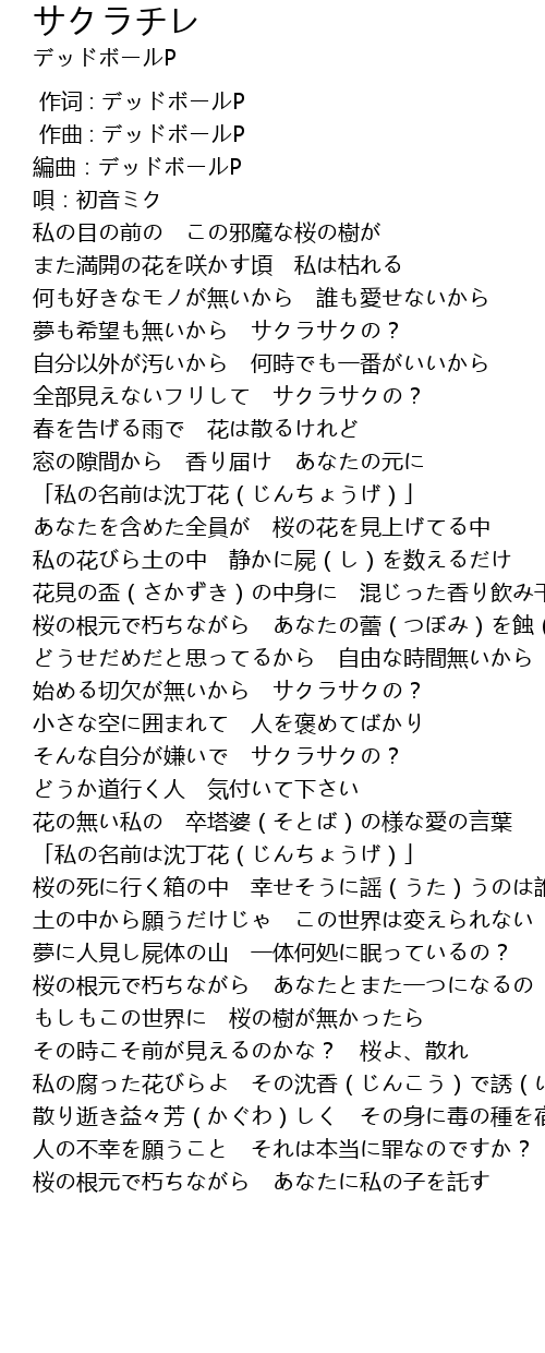 | [02:39.778] | 桜の死に行く箱の中 幸せそうに謡(うた)うのは誰? |