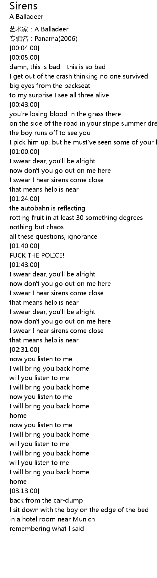 | [01:52.00] | I swear I hear sirens come close |