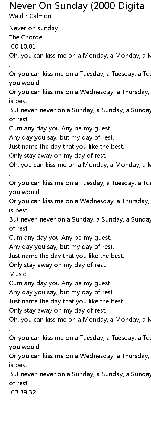 But never, never on a Sunday, a Sunday, a Sunday, cause that' s my day of rest. |