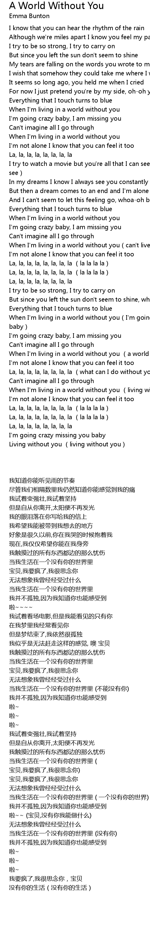 | [03:21.79] | When I' m living in a world without you a world without you |
