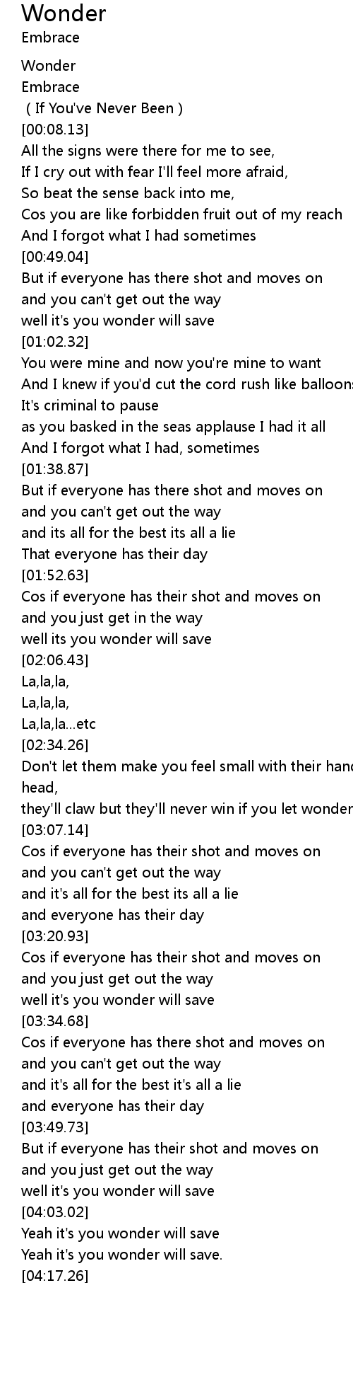 | [04:03.94] | Yeah it' s you wonder will save |