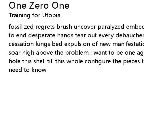 | fossilized regrets brush uncover paralyzed embedded regularity deep incision end to end desperate hands tear out every debauchery one to zero zero to one abrupt cessation lungs bed expulsion of new manifestation wings beg let, let me fly soar high above the problem i want to be one again, please help love lie this hole this shell till this whole configure the pieces tell me when you have it i need to know |