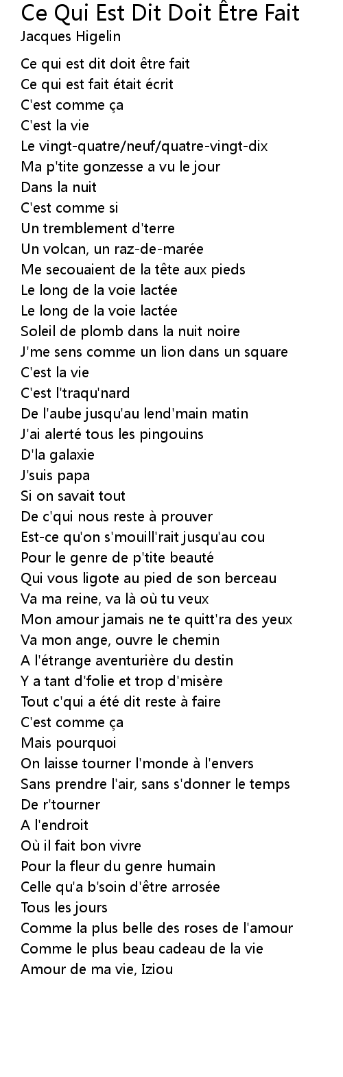 | Song | Ce Qui Est Dit Doit Être Fait |