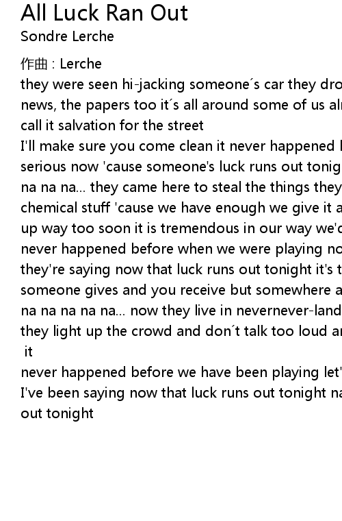 | I' ll make sure you come clean it never happened before when we were playing it' s serious now ' cause someone' s luck runs out tonight it' s a terrible fright na na na na na... they came here to steal the things they lack computer equipment and chemical stuff ' cause we have enough we give it away but someone let the steam up way too soon it is tremendous in our way we' d never seen it in our street it never happened before when we were playing now tv shows are talking and all they' re saying now that luck runs out tonight it' s this simple you believe someone gives and you receive but somewhere along the way all luck ran out again na na na na na... now they live in neverneverland claiming they re tourists they light up the crowd and don t talk too loud anymore but i' m sure we will see their brother soon already racing to be first they find it hard to ... it never happened before we have been playing let' s do it forget what | |